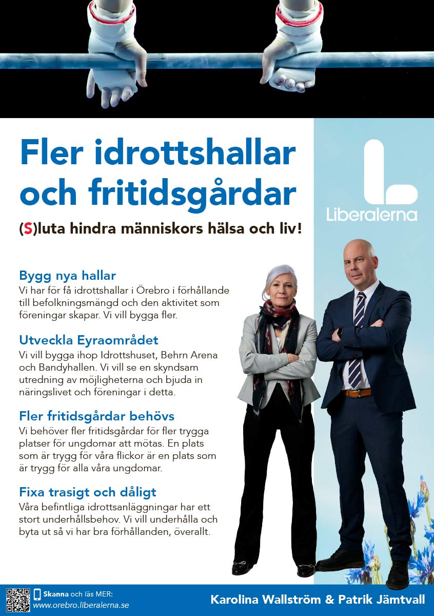 – Örebro kommun behöver fler idrottshallar. Fler ska kunna idrotta. Vi ska ha plats för både elit- och breddidrott. Perfekt att Moderaterna ser samma möjligheter som vi med Eyrafältet. Ett arenabolag kan utveckla området mycket bättre än kommunen. Vi vill bygga flera nya 40*20-hallar, vi vill också underhålla det vi redan har, underhållsskulden tickar vidare varje dag. Vi ser också behov av fler fritidsgårdar. Vi måste (S)luta lägga hinder för människors hälsa och liv, säger Patrik Jämtvall, (L) talesperson i samhällsbyggnadsfrågor.